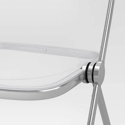 This Metal Acrylic Folding Chair from Room Essentials™ makes a versatile addition to your seating. This armless chair has a metal frame and a clear acrylic seat and upper back support for a modern aesthetic. The foldable design ensures easy storage, making it ideal for any event. Pull up the chair for a card game or for extra seating around the dining table.
