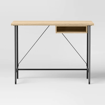 Put together a stylish home office with this Wood and Metal Writing Desk with Storage from Room Essentials™. Standing on metal frame for stability, this writing desk features an ample-sized wooden tabletop, while the open storage shelf provides space for all your office supplies. With a simple clean-lined silhouette, this writing desk complements nearly any decor style or color palette.